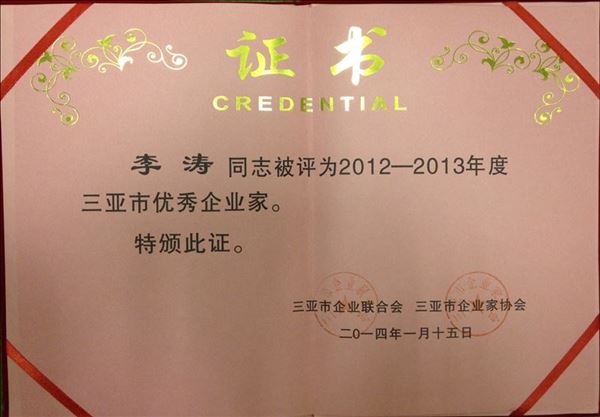 1月15日,由三亞市企業(yè)聯(lián)合會、三亞企業(yè)家協(xié)會主辦的“2013年三亞市百強(qiáng)企業(yè)暨功勛、優(yōu)秀企業(yè)家表彰大會”在三亞市委黨校舉行。三亞市委副書記、常務(wù)副市長吳巖峻等領(lǐng)導(dǎo)出席表彰大會,為受表彰的企業(yè)家頒發(fā)獎牌。亞龍灣華宇度假酒店被授予“三亞市百強(qiáng)企業(yè)”榮譽(yù)稱號,三亞華宇旅業(yè)有限公司總經(jīng)理李濤被授予“三亞市優(yōu)秀企業(yè)家”榮譽(yù)稱號。